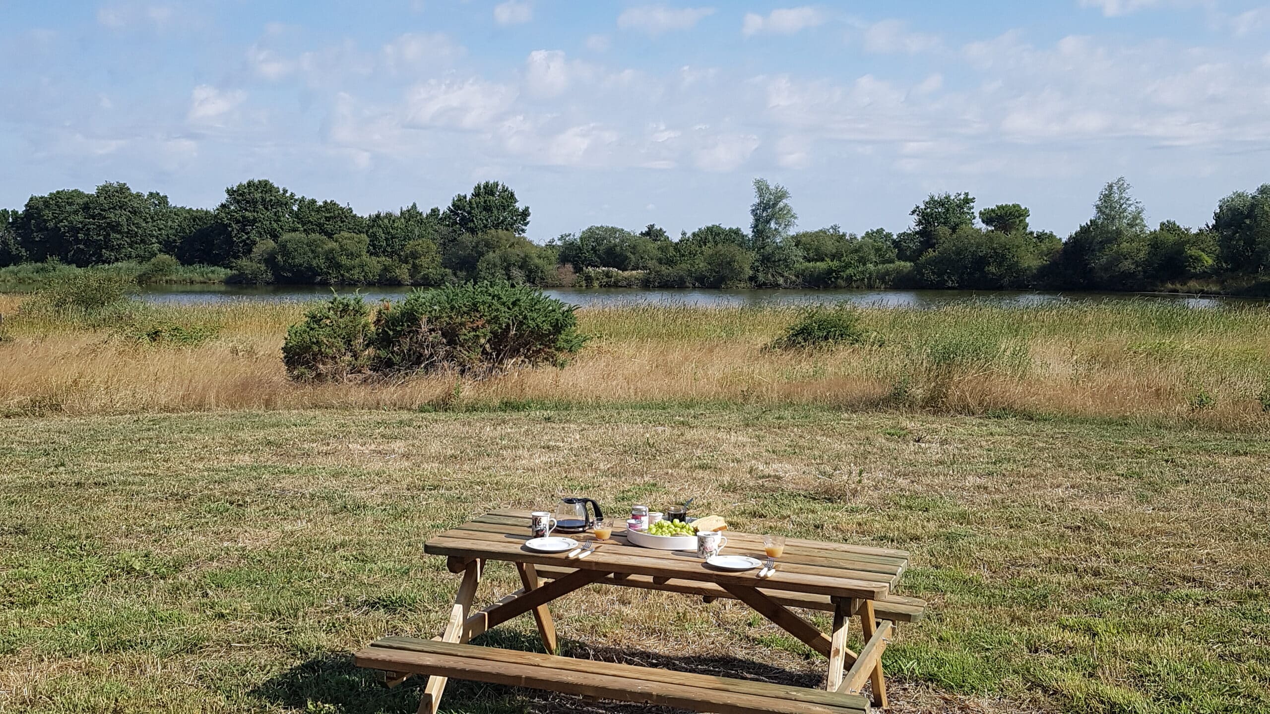 Vous entrerez sur un espace commun avec cuisine équipée accessible à tous, un espace détente et un accès en terrasse avec vue sur le second étang .