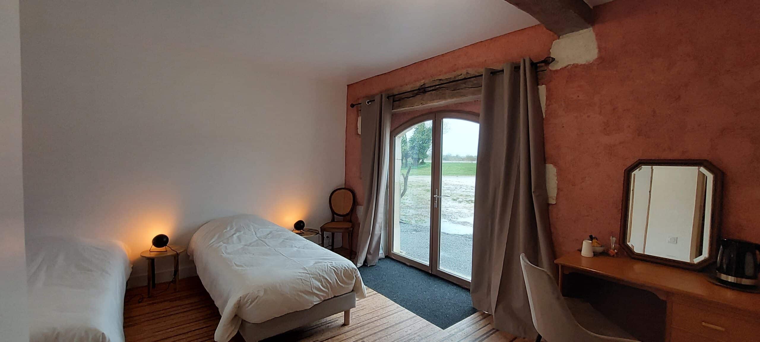 - Deux chambres (dont 1 accessible PMR) sont au rez-de-chaussée avec sortie sur jardin extérieur et vue sur le second étang.